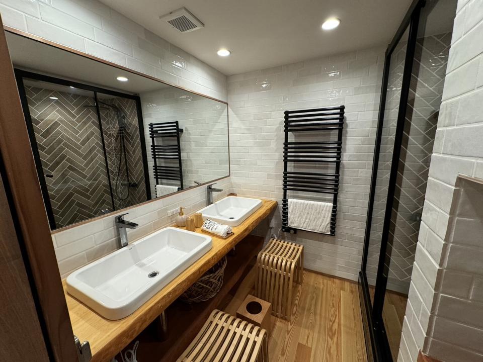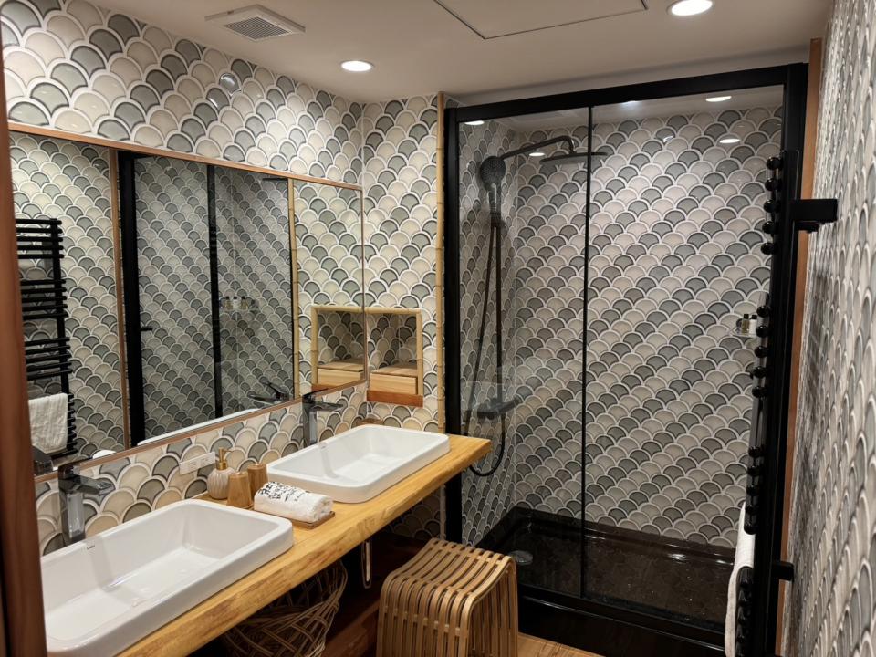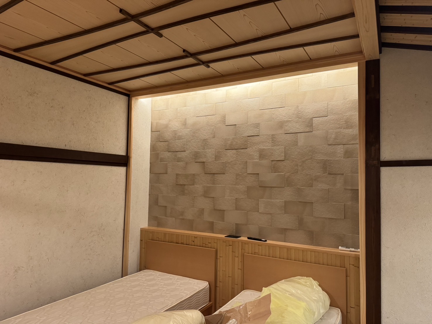 某旅館の内装工事をさせていただきました。 大浴場の石積み、壁タイル貼り、床洗い出し、客室は壁塗り、洗面室エコカラット貼り、休憩スペースの床タイル貼り、玄関前の石敷きなどたくさんありました。 大型の工事で完工まで2か月以上かかりましたが、社長のこだわりを形にしたい一心で取り組みました。 歴史のある建物の工事に携われ、大変貴重な経験をさせていただきました。