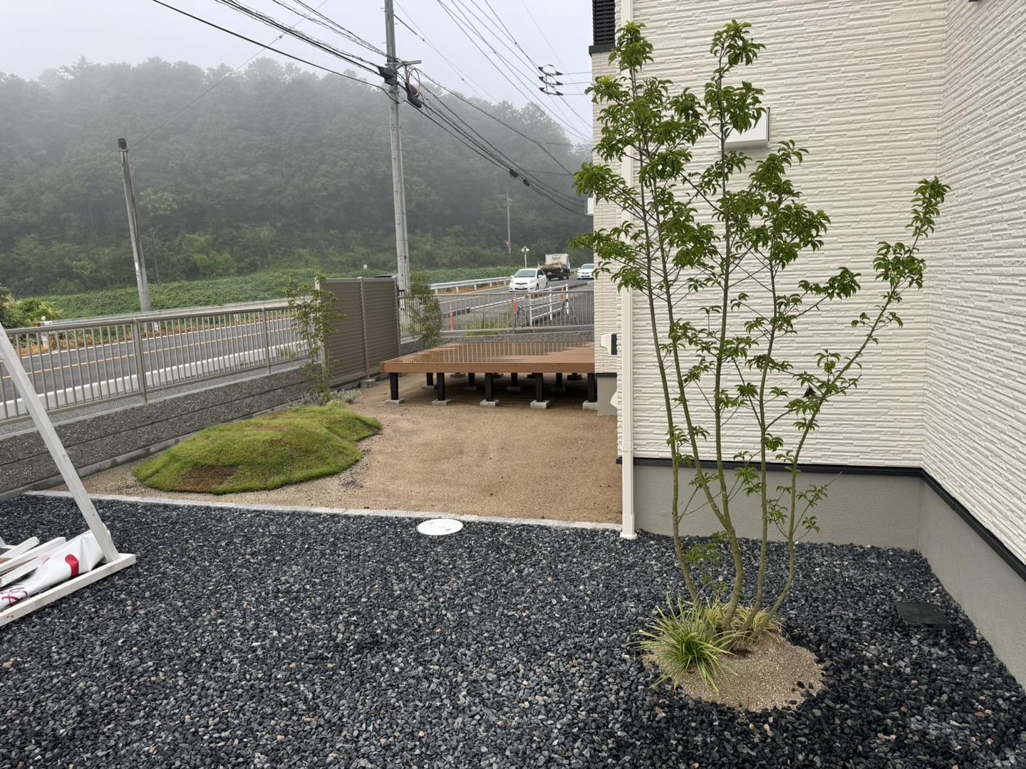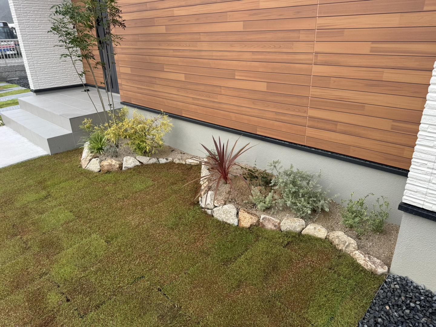 津山市某ハウスメーカーのモデルハウス外構工事をさせていただきました。 展示イベントの為、少し短い工期でしたが無事完工しました。 広い範囲の芝生、植栽もあり緑豊かになっています。アプローチは他社様の施工ですが、ローラーストーンで模様をつけて完成しました。