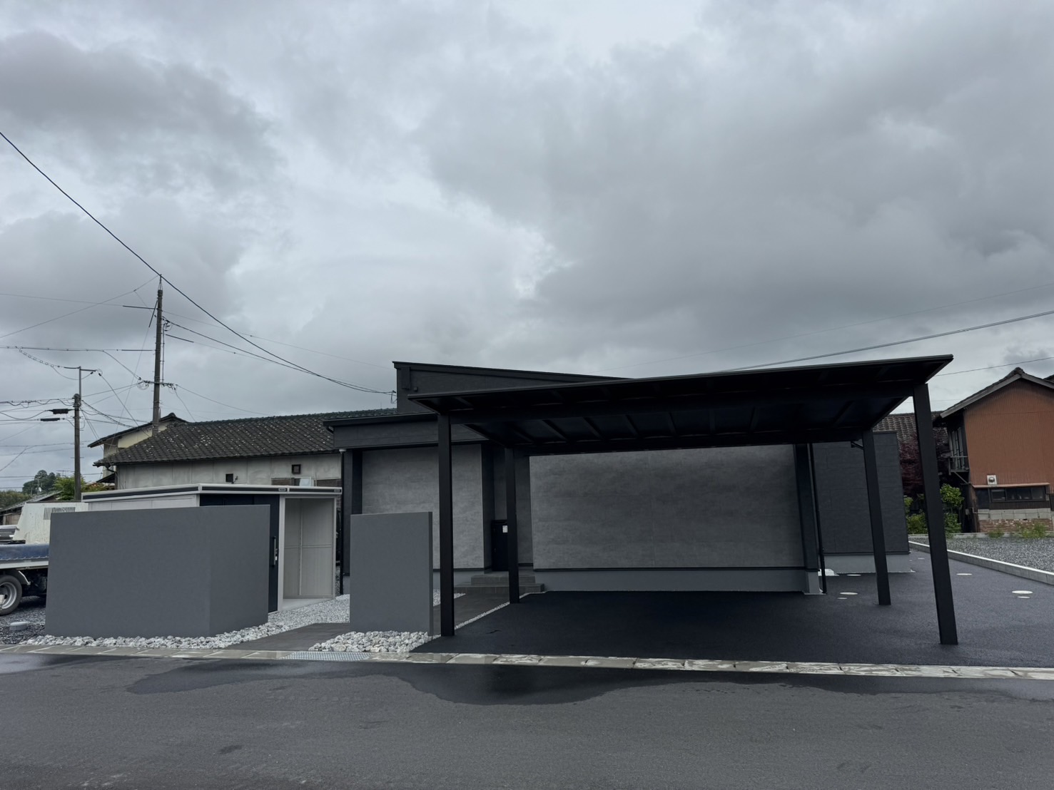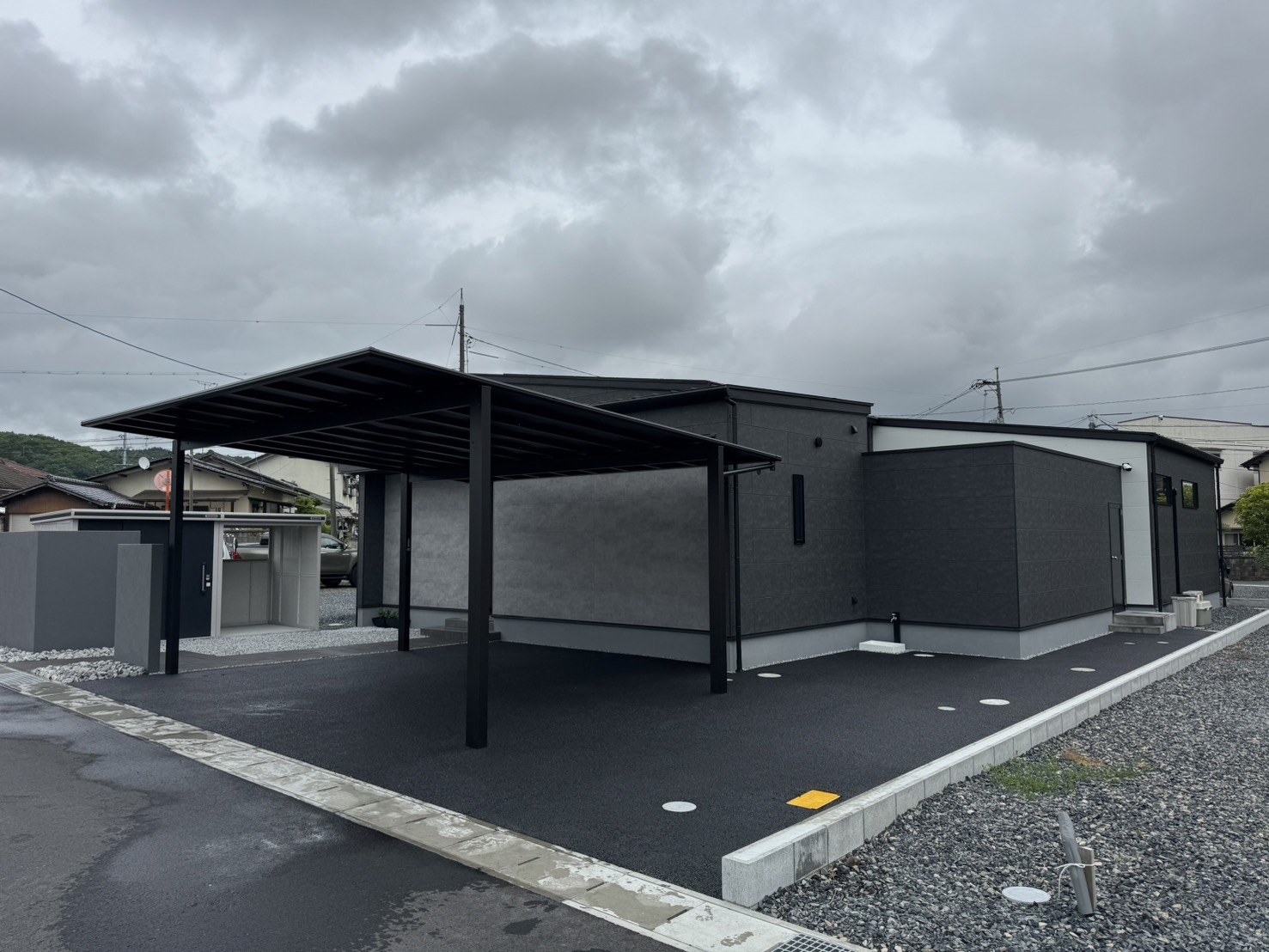 カーポートは当時、最新の屋根材(ブラックマット色)を使用しています。